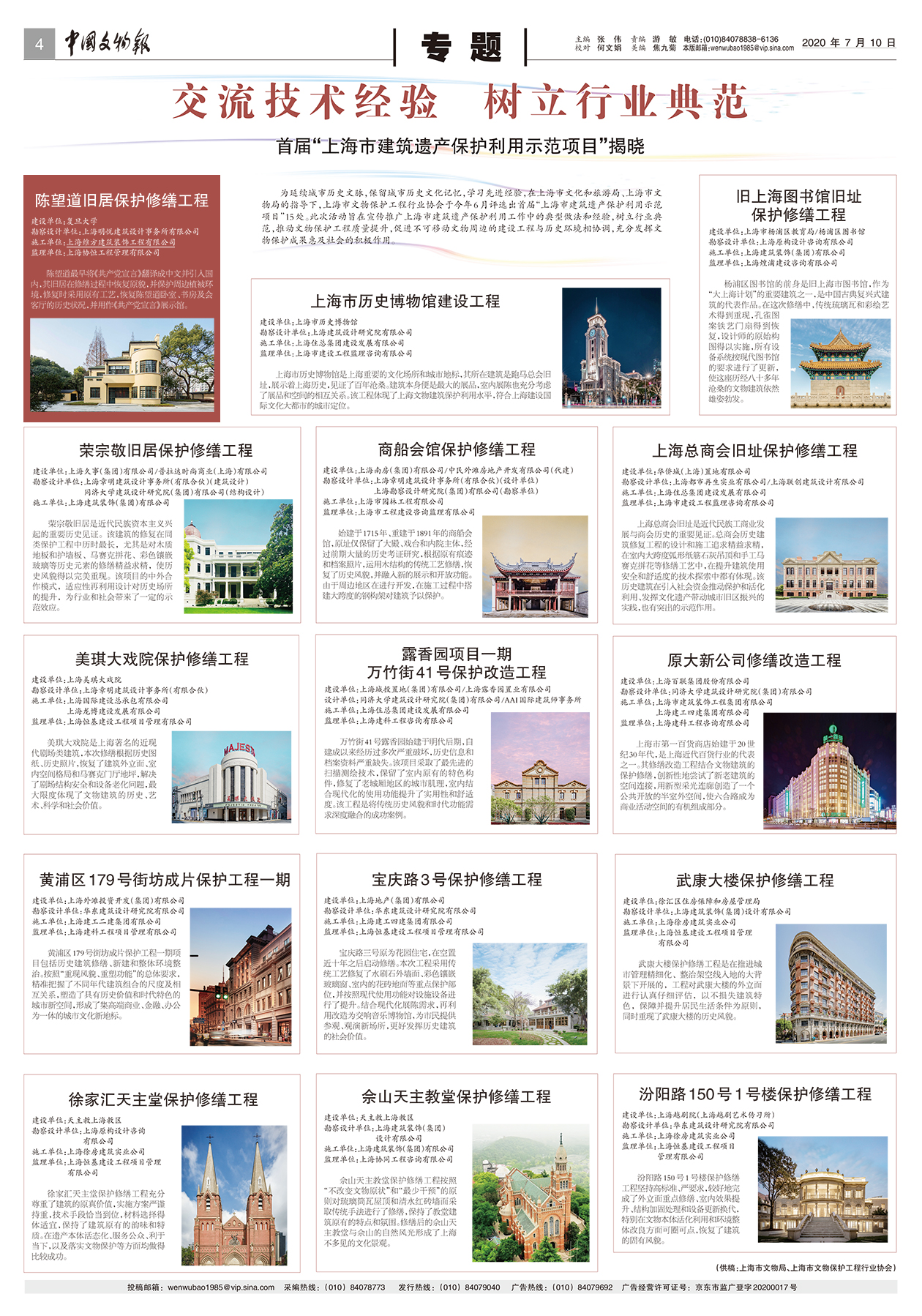 為延續(xù)城市歷史文脈,保留城市歷史文化記憶,學(xué)習(xí)先進(jìn)經(jīng)驗(yàn),在上海市文化和旅游局、上海市文物局的指導(dǎo)下,上海市文物保護(hù)工程行業(yè)協(xié)會(huì)于今年6月評(píng)選出首屆“上海市建筑遺產(chǎn)保護(hù)利用示范項(xiàng)目”15處。